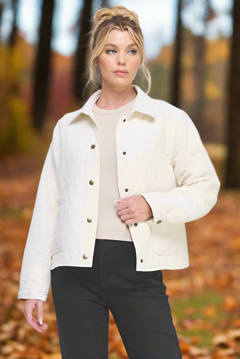 Allie Rose Texture Fabric Quilted Button Up Collared Jacket with Front Pockets