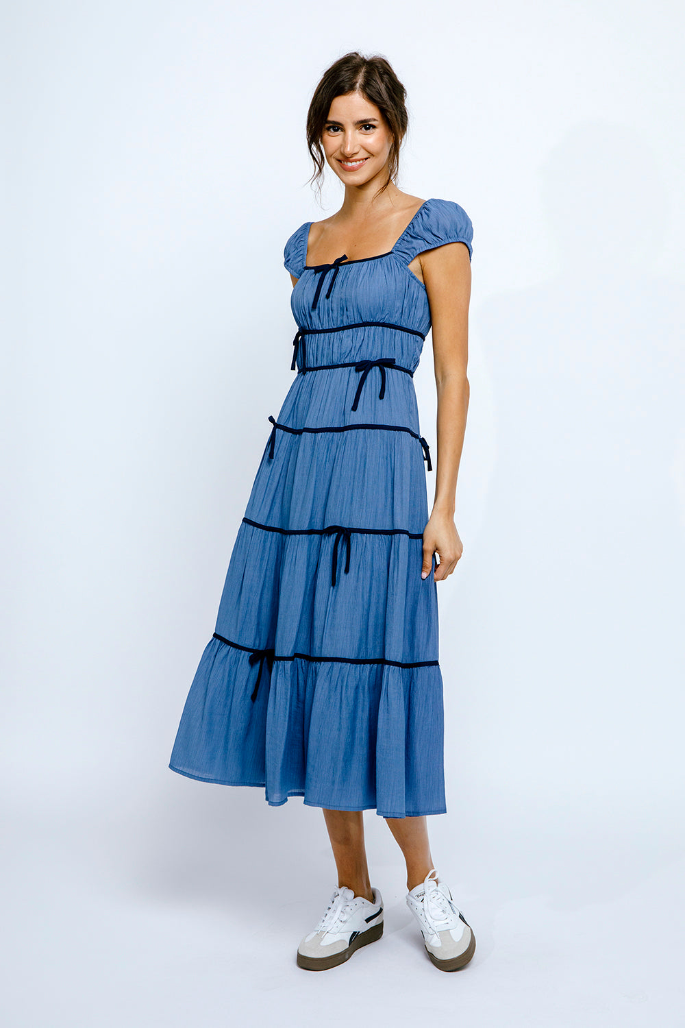 Playful yet romantic, this blue midi dress features tiered layers accented with delicate black bow ties.