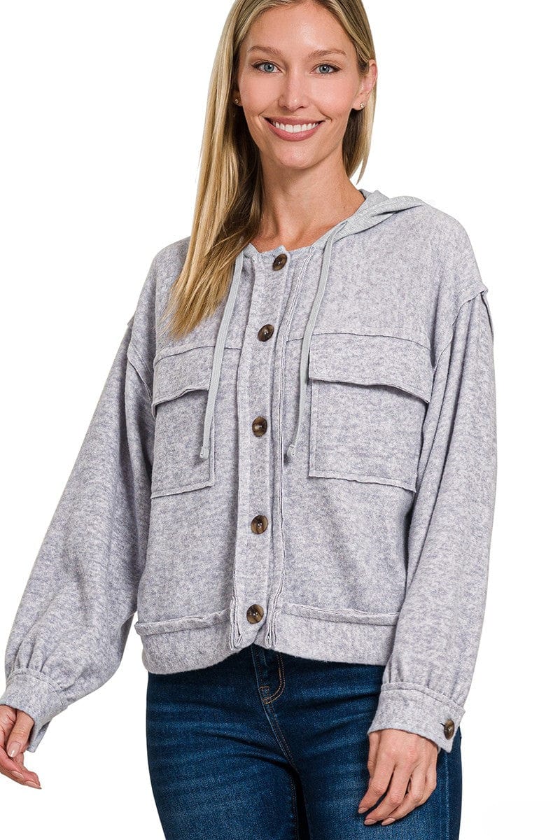 Zenana Brushed Hacci Hooded Button Down Shacket